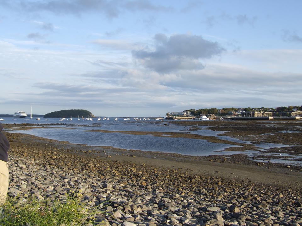 View of Bar Harbor from Bar Island with cruise ship (upper left). The bar is on the right (not fully visible).