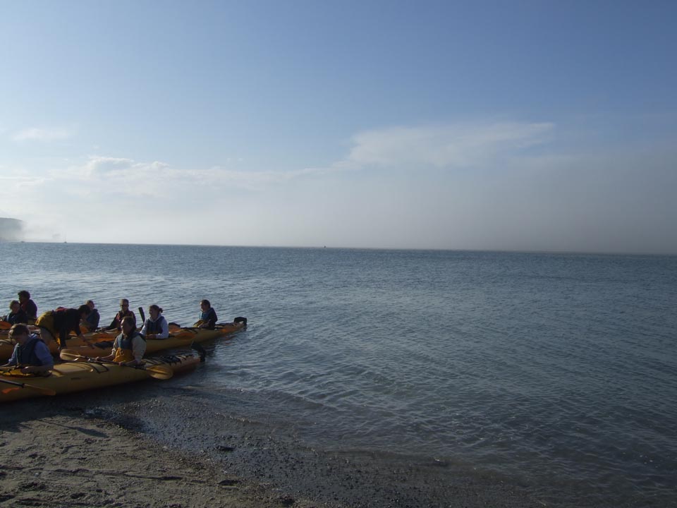 Kayakers launching across the submerged bar of Bar Harbor. Bar Island is on the right obscured by a fog bank.