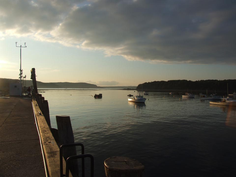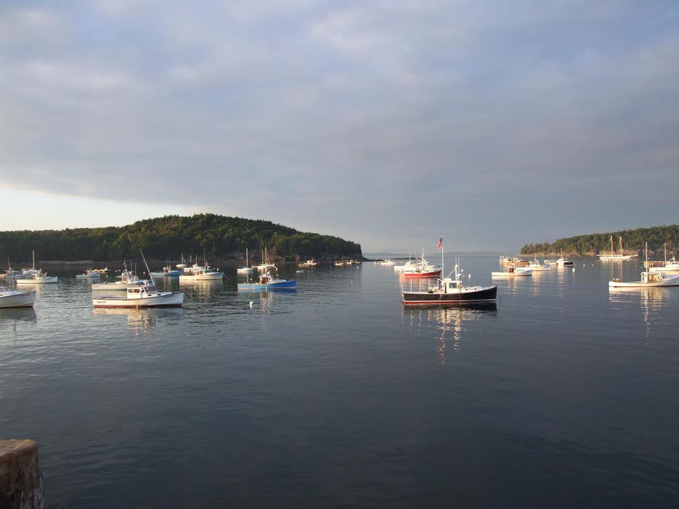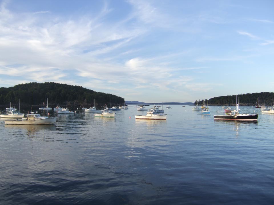 View of the harbor from the town wharf in evening light of August with Bar Island on the left Porcupine Island on the right.